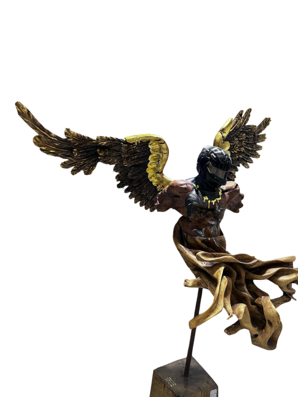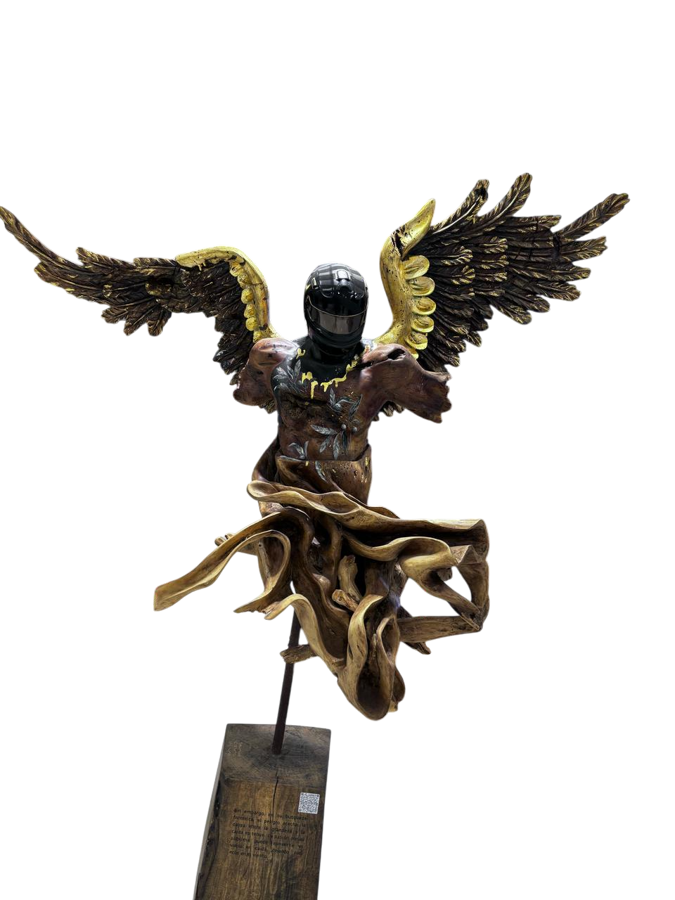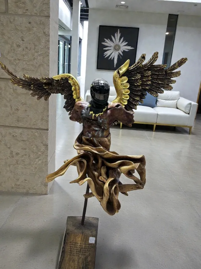Venta $250,000.00 El precio original era: $250,000.00.$170,000.00El precio actual es: $170,000.00. Escultura de madera tallada con alas doradas y casco de carreras. 1 disponibles Añadir al carrito Categoría: Esculturas Etiquetas: ángel, arte madera, casco F1, escultura mística