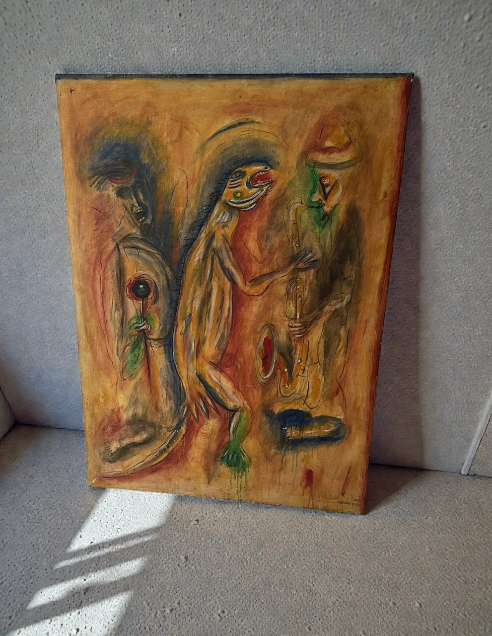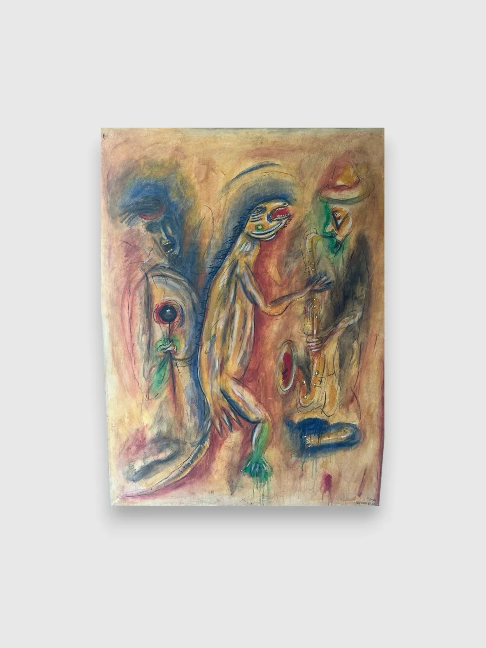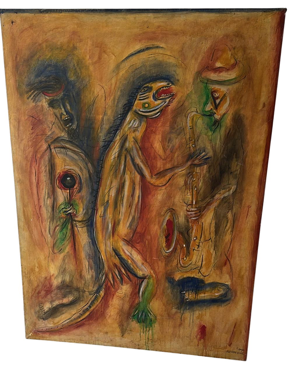 Realizada en 2002 en Orleans, San Ángel, Origen es una pintura de lenguaje simbólico y visceral. Figuras híbridas —humanas, animales y musicales— conviven en un plano emocional más que narrativo. El color es orgánico, casi terroso, y las líneas parecen surgir desde el subconsciente. No hay jerarquía visual: todo pulsa al mismo tiempo, como un ritual detenido en el lienzo.
