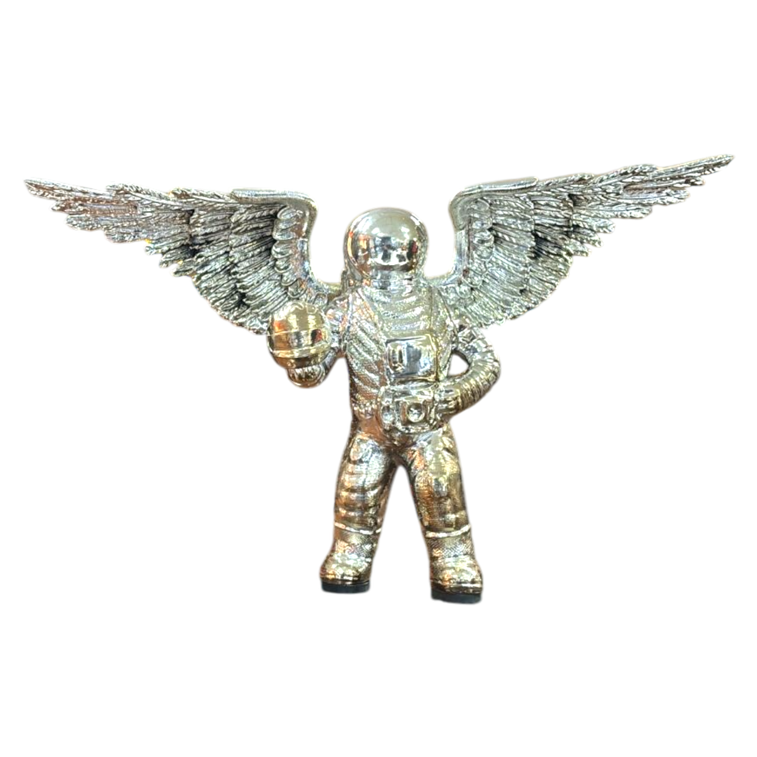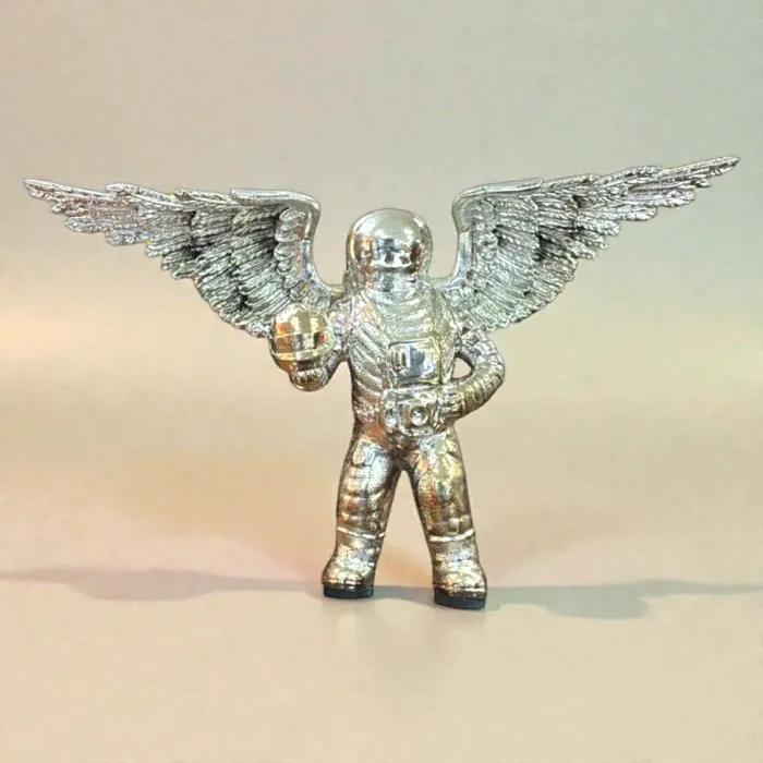 Esta escultura de astronauta con alas está hecha en cerámica de alta calidad con un recubrimiento metálico en tono plata. Es una pieza de arte única que representa la fusión entre el espíritu explorador humano y la fantasía artística.