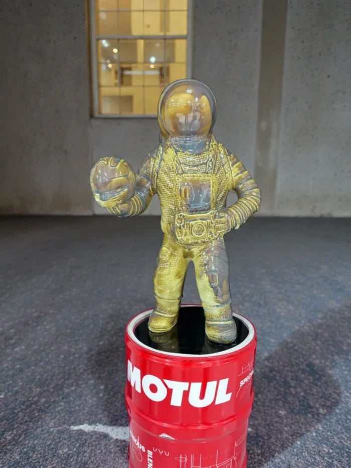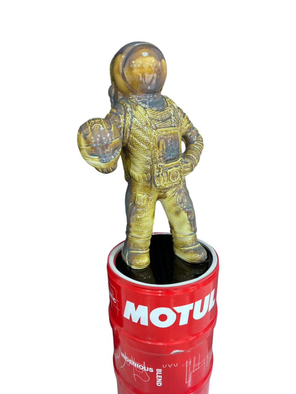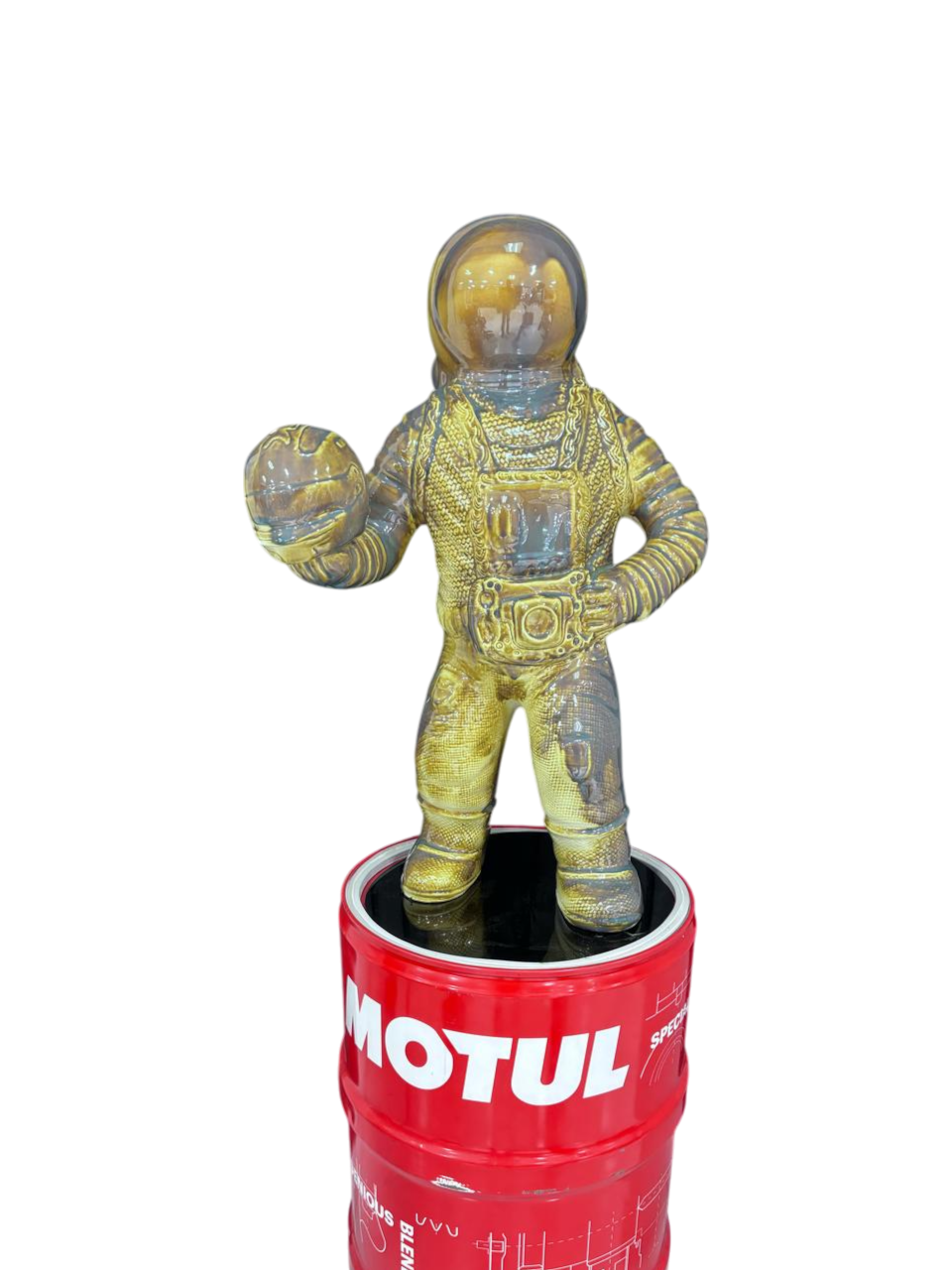 Astronauta en cerámica con acabado dorado tipo tornasol sobre base MOTUL.