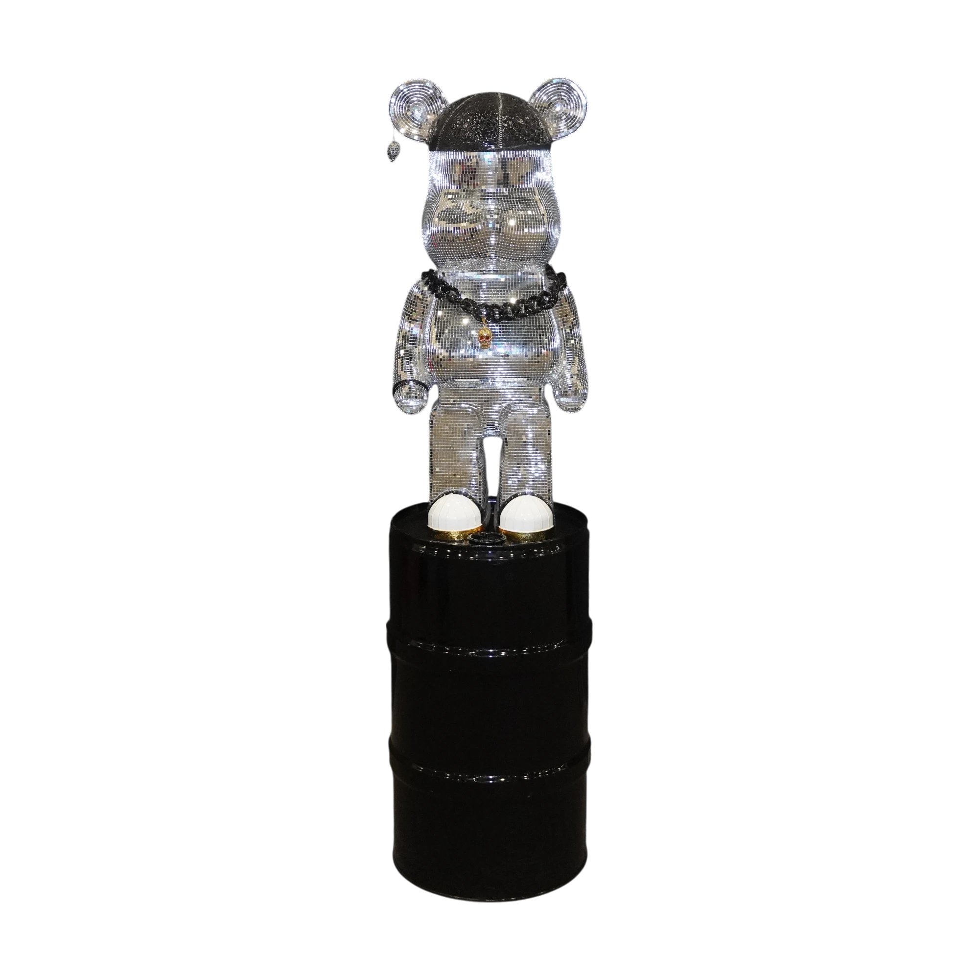 Atrévete a destacar con esta pieza de arte decorativo contemporáneo: un oso de diseño tipo Bearbrick completamente cubierto con pequeños cristales tipo espejo, montado sobre un tambor metálico negro brillante.
