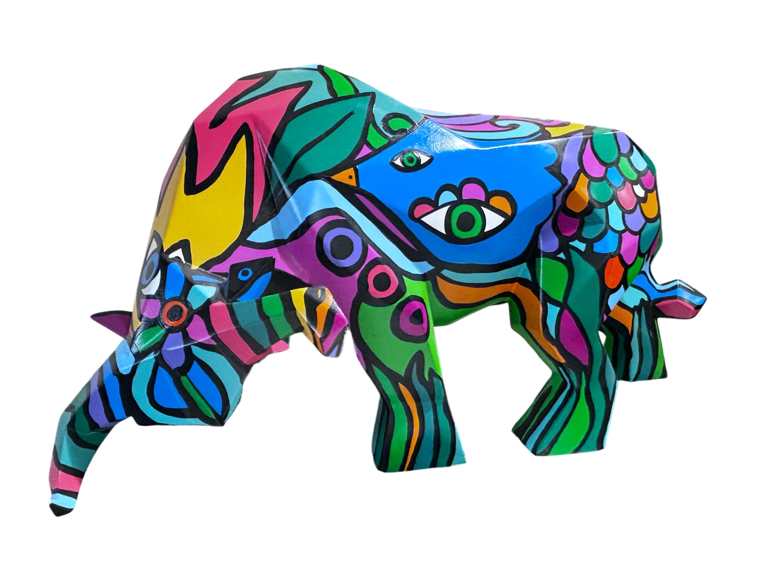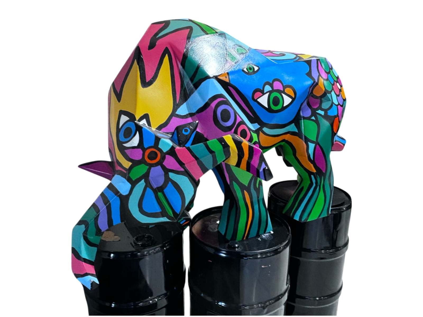 Figura de toro intervenido con arte pop de alto contraste y patrones de ojos, hojas y texturas inspiradas en el arte urbano y la psicodelia tropical. Pieza vibrante para espacios atrevidos.