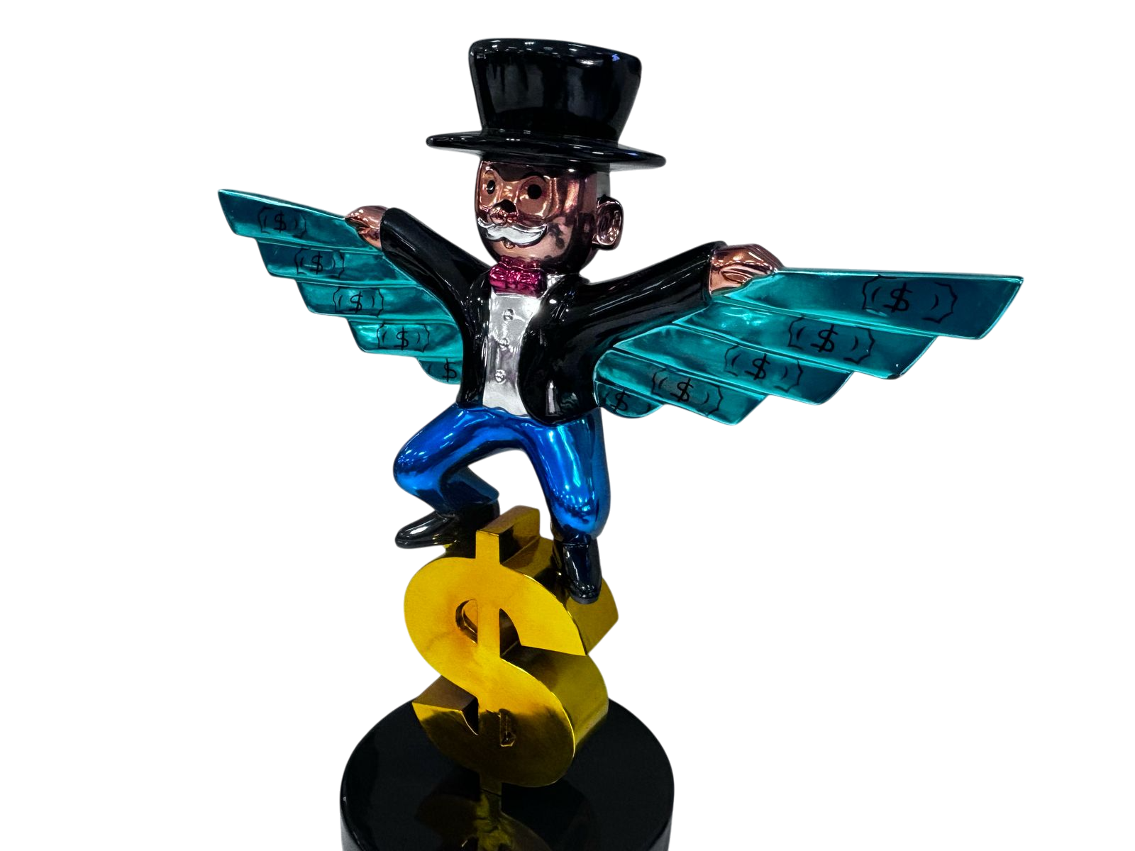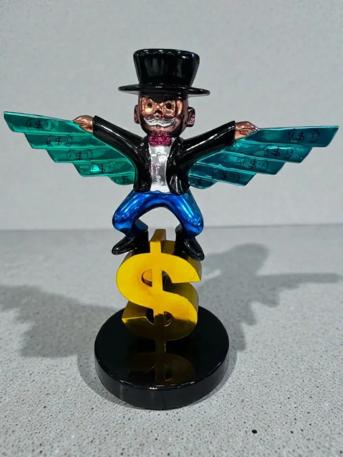 Figura artística que representa el vuelo del capital. Un millonario con sombrero y alas decoradas con signos de dólar, montado sobre un símbolo ‘$’ dorado. Estética irónica, colorida y provocadora.