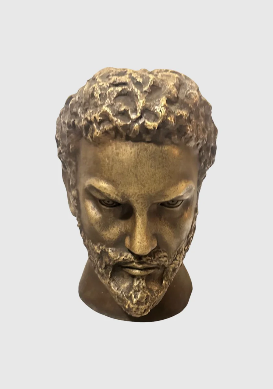 Este autorretrato captura la esencia del artista en un gesto severo y profundamente humano. El tratamiento de la superficie —texturas orgánicas, volúmenes contundentes y pátina metálica— refuerza una presencia atemporal que dialoga con la escultura clásica desde un lenguaje contemporáneo. No es decoración pasiva: es una pieza que observa, interpela y eleva el espacio.
