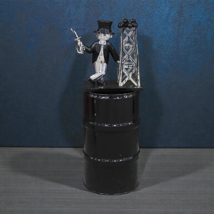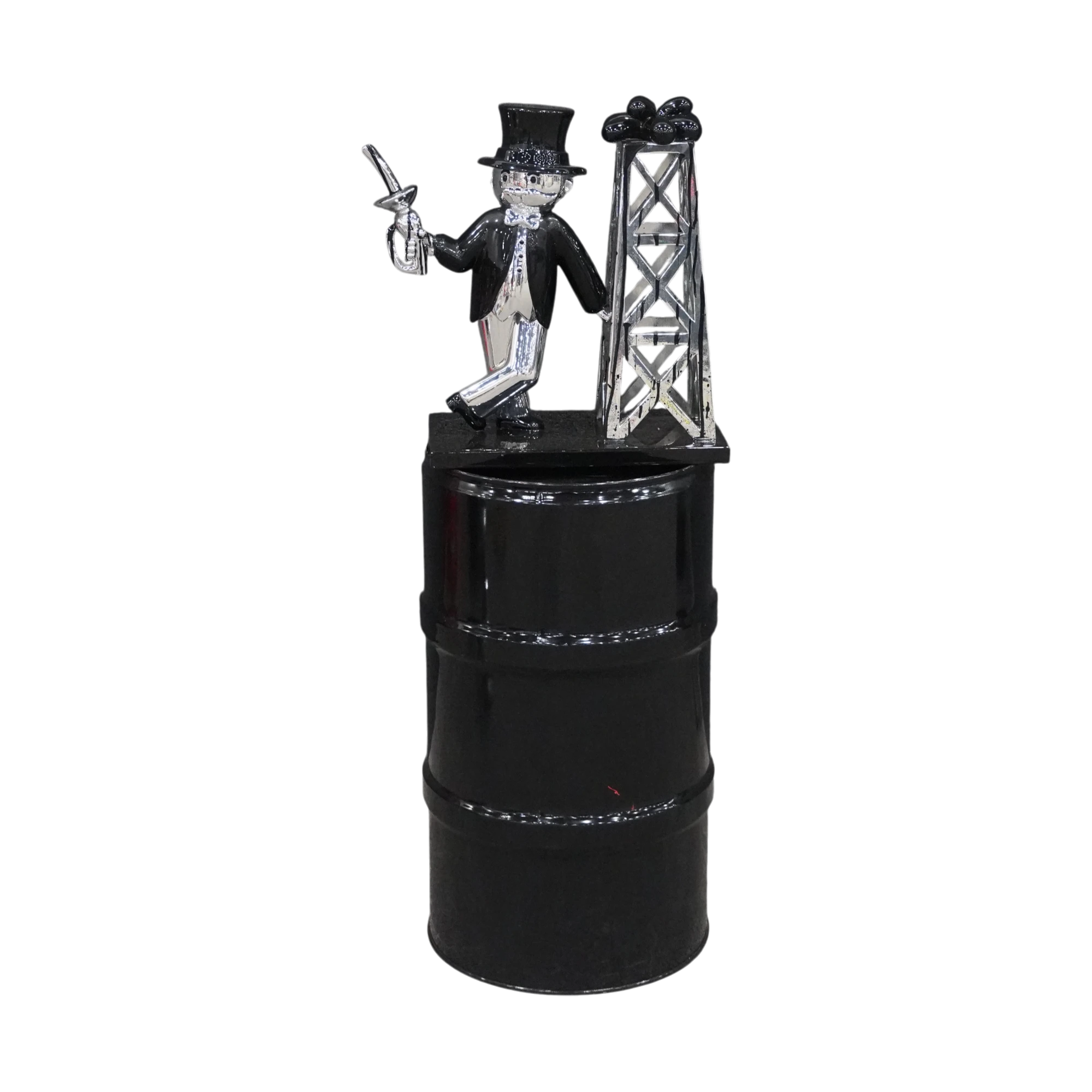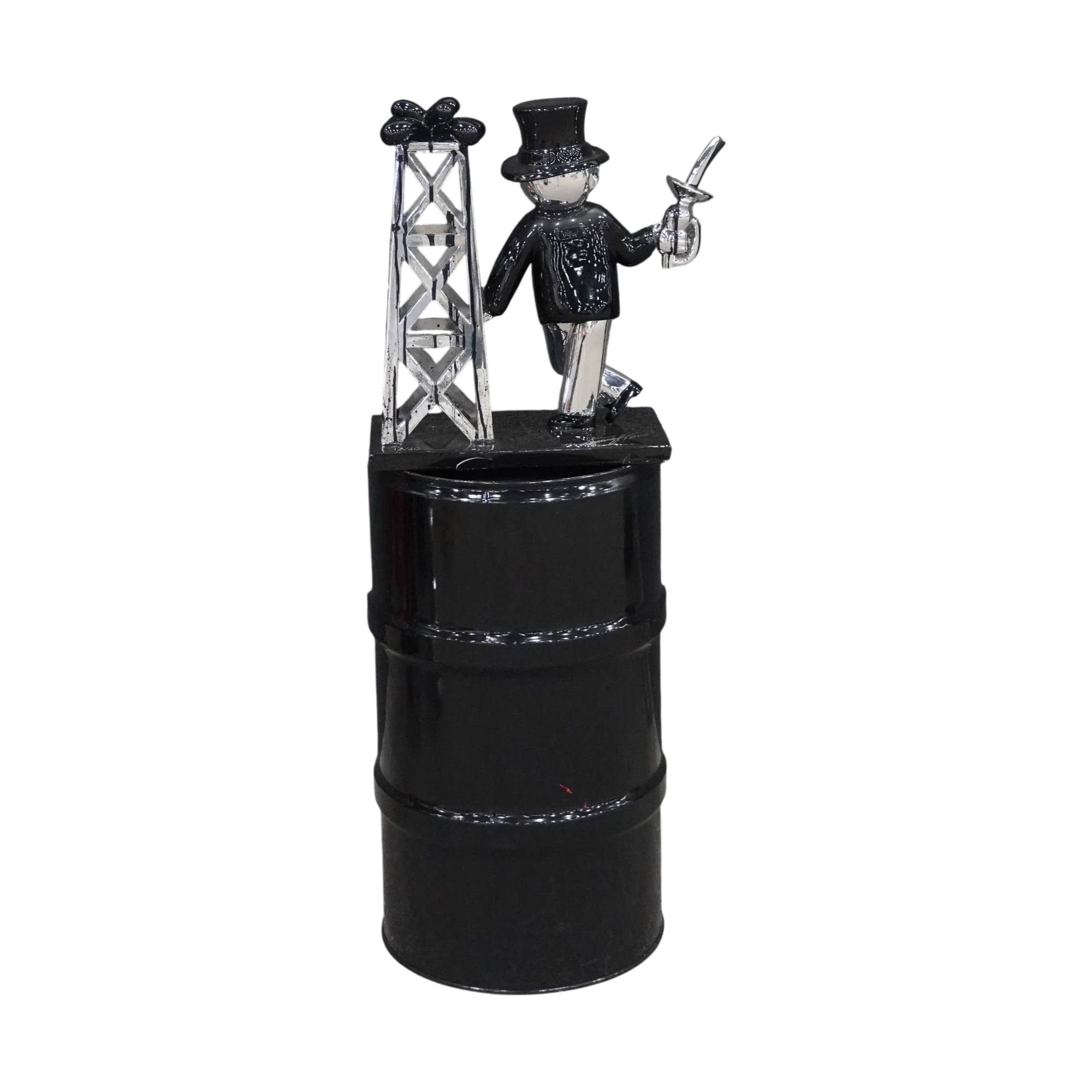 Dale a tu espacio un giro irreverente con esta escultura única de estilo pop art industrial, que muestra a un personaje millonario (inspirado en el famoso ícono del Monopoly) junto a una torre petrolera, todo sobre un tambor metálico negro.
