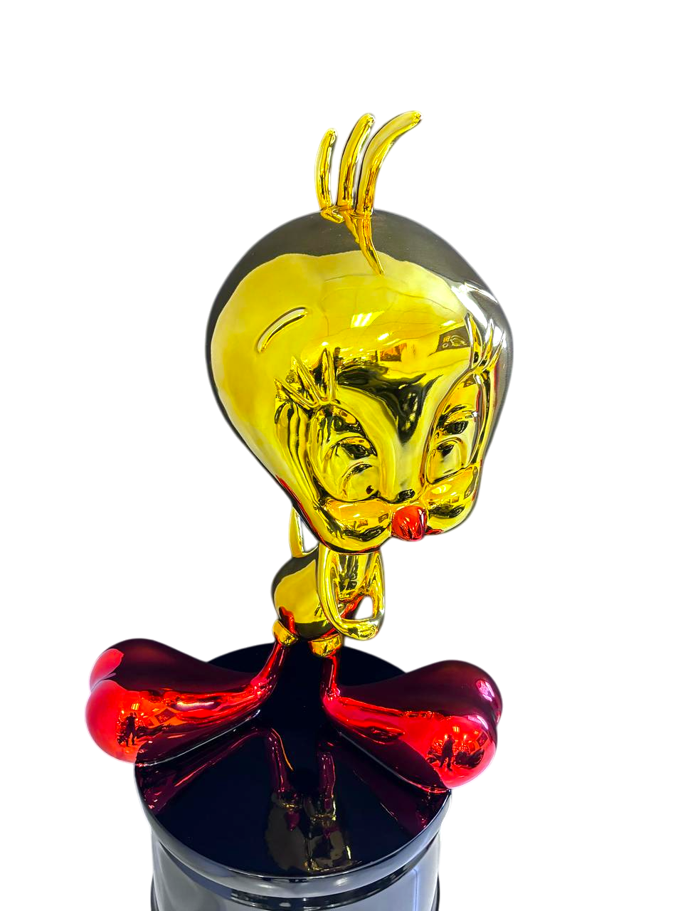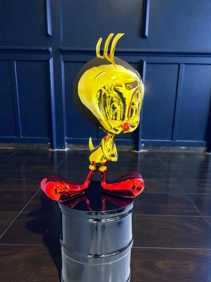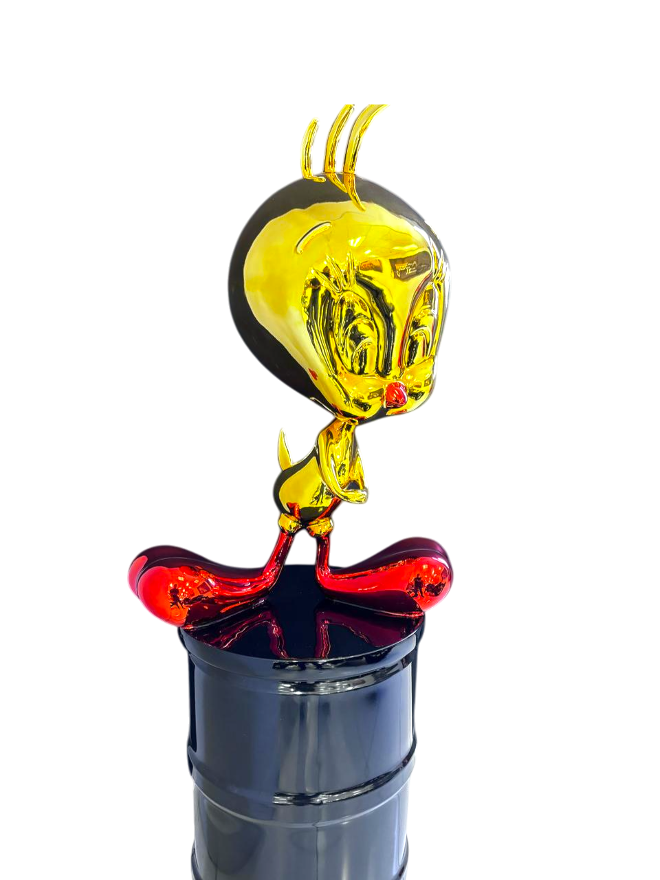 Interpretación artística de Piolín con acabado metálico dorado y rojo. Escultura llamativa y juguetona, montada sobre barril industrial negro para contraste visual.