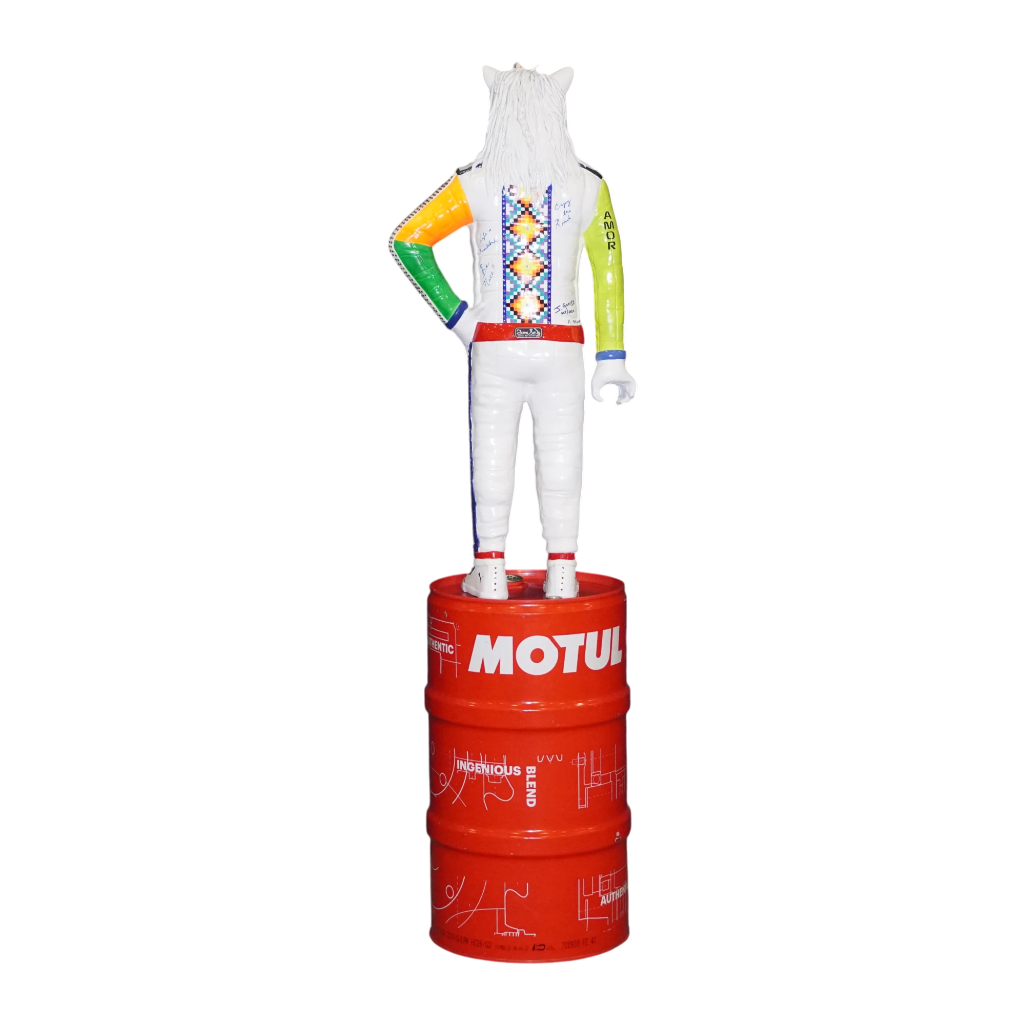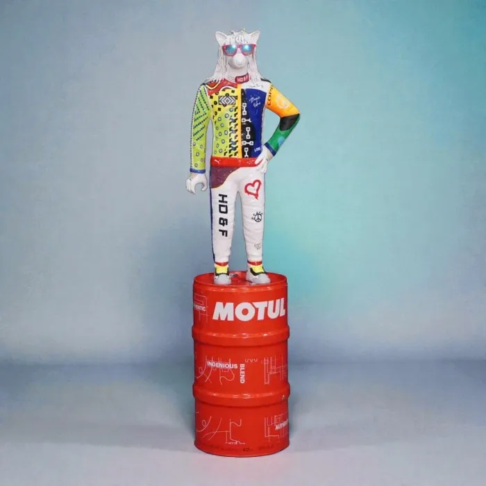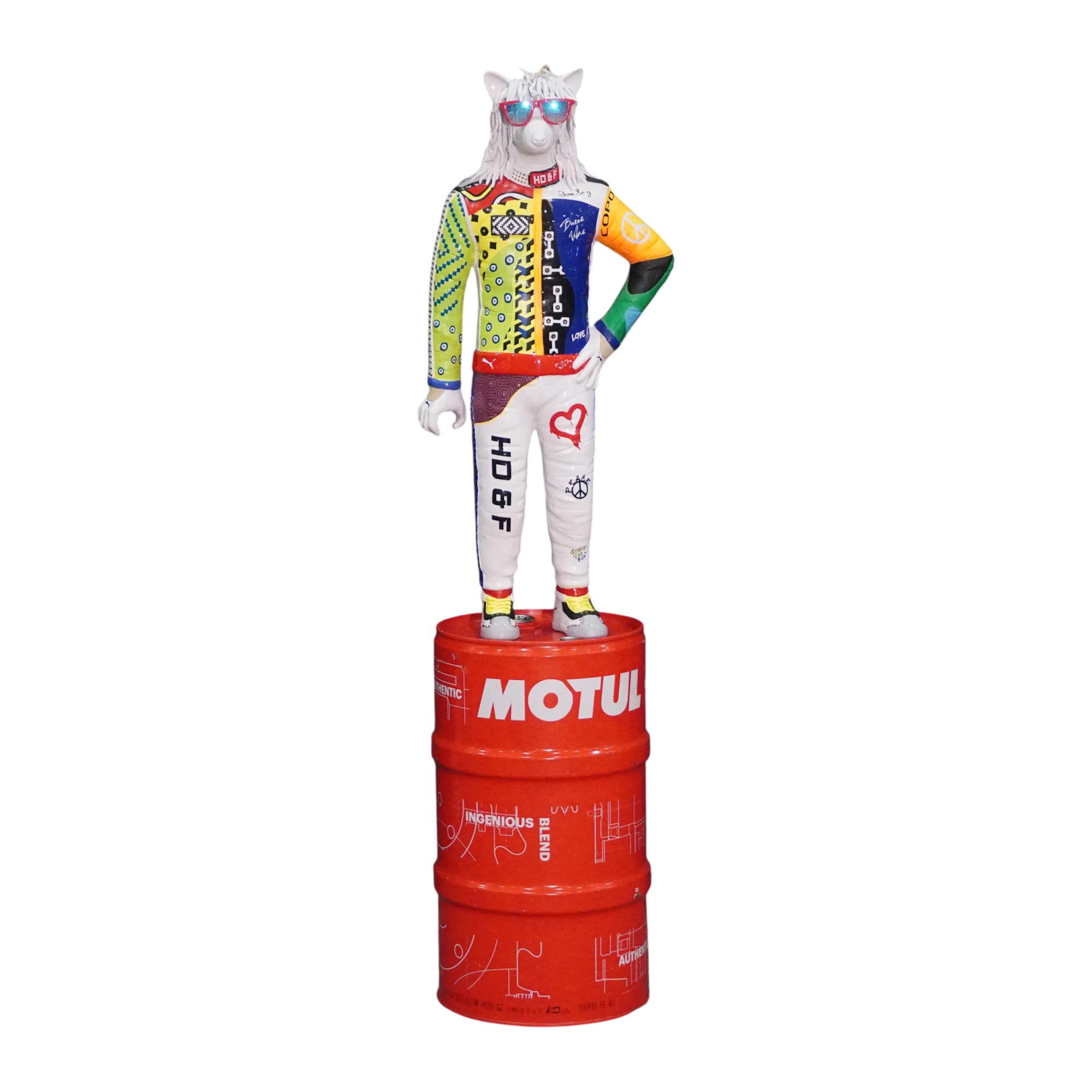 Esta escultura representa a un unicornio humanoide con gafas, melena blanca y un outfit de alto impacto: chamarra multicolor tipo patchwork, pantalones con frases urbanas y postura confiada. Está montado sobre un tambor MOTUL que refuerza el contraste entre la cultura callejera y el mundo industrial.