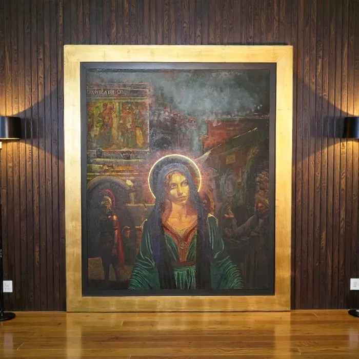 Esta poderosa obra nos presenta una figura mariana reinterpretada, situada en un entorno urbano decadente que evoca el colapso de las estructuras religiosas, políticas y culturales. El fondo, cargado de referencias históricas y simbólicas, contrasta con la calma intensa del rostro de la virgen. Técnica mixta con trazos clásicos y composición contemporánea. Ideal para espacios donde se respira arte con discurso.